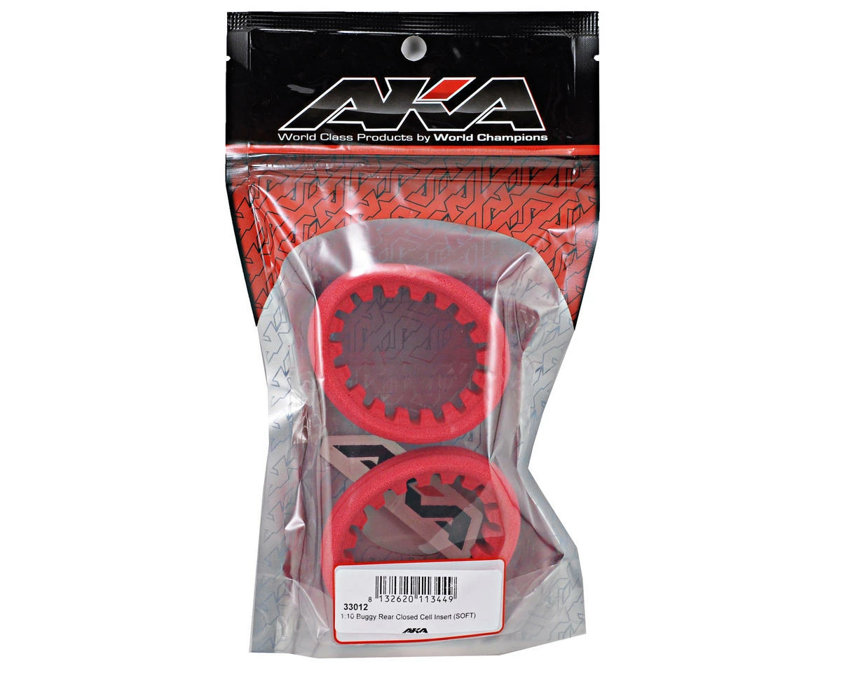 This is a set of two AKA Racing 1/10 Buggy Closed Cell Rear Tire Inserts. AKA, the pioneer of the closed cell insert, has shrunk down the technology, and developed an insert specifically for use with 1/10 scale buggies. The 1/10 inserts are slightly softer than the AKA38001S Red 1/8 inserts, so they work better with the light weight 1/10 buggies, while at the same time maintaining the durability that AKA inserts are known for.