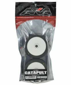 This is a pack of two AKA Racing Catapult 1/8 Buggy Tires, pre-mounted on white EVO wheels. The 1/8 Catapult is engineered to offer a balance of life and traction on dusty abrasive tracks. The larger lugs minimize wear, while the “C” shaped treads dig through the dust to find grip.