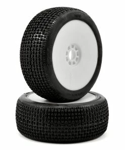 This is a pack of two AKA Racing Catapult 1/8 Buggy Tires, pre-mounted on white EVO wheels. The 1/8 Catapult is engineered to offer a balance of life and traction on dusty abrasive tracks. The larger lugs minimize wear, while the “C” shaped treads dig through the dust to find grip.