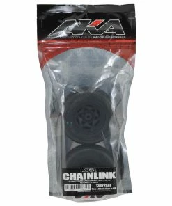 This is a pack of two AKA Racing Chain Link Wide Short Course Tires. These tires have been pre-mounted on black AKA Cyclone wheels that are intended for use with the Team Associated SC10 4×4. The Chain Link features a bi-level, interlocking tread pattern that creates support for the tire’s carcass and treads. This additional support provides consistency through corners and on-throttle stability. The Chain link delivers a great balance of forward drive and side bite that is ideal for hard packed or blue groove, indoor and outdoor tracks. As with all AKA tires, these are proudly designed and made in the USA.