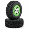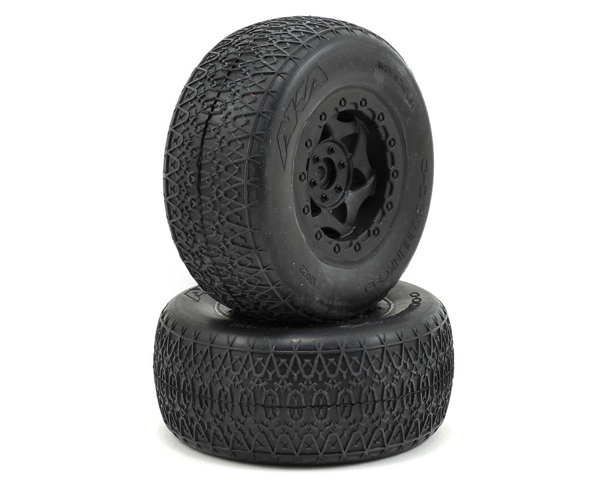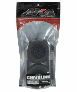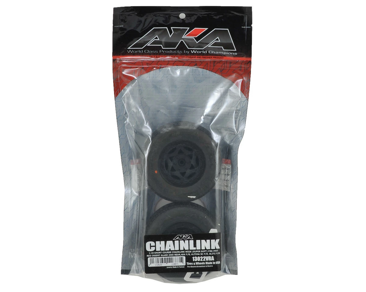 This is a pack of two AKA Racing Chain Link Wide Short Course Tires. These tires have been pre-mounted on black AKA Cyclone wheels that are intended for use with trucks that use a “Slash” offset rear wheel. The Chain Link features a bi-level, interlocking tread pattern that creates support for the tire’s carcass and treads. This additional support provides consistency through corners and on-throttle stability. The Chain link delivers a great balance of forward drive and side bite that is ideal for hard packed or blue groove, indoor and outdoor tracks. As with all AKA tires, these are proudly designed and made in the USA.