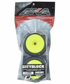 This is a set of two AKA City Block 1/8th scale off-road buggy tires, pre-mounted on yellow EVO wheels. AKA’s R-Line pre-mounts feature AKA’s World Championship winning EVO wheel, and when combined with the stiffener disc (34003Y or 34003W), is the most technically advanced wheel available. The R-Line pre-mount also features AKA’s soft red insert (34001S) which was used by Cody King to win the 2010-2011 1/8 Buggy IFMAR World Championships. Combine these two revolutionary products with the quality and endurance of AKA tires and the result is the most technically advanced pre-mounted tires ever offered for 1/8 Buggies.Â