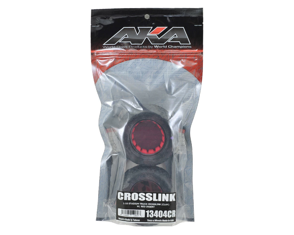 This is a pack of two AKA Crosslink 2.2″ Off-Road Truck Tires with included red inserts. The Crosslink features a symmetrical open tread pattern designed to break in quickly and provide unmatched forward traction. This additional forward traction is perfect for today’s high powered 1/10 stadium trucks and allows a more aggressive steering setup without the worry of losing on-power control. The Crosslink has been designed for hard packed or blue groove, indoor and outdoor tracks. Available in championship winning Clay, Ultra Soft and Super Soft compounds with Red inserts.  Â