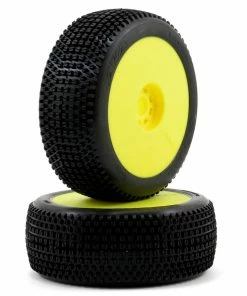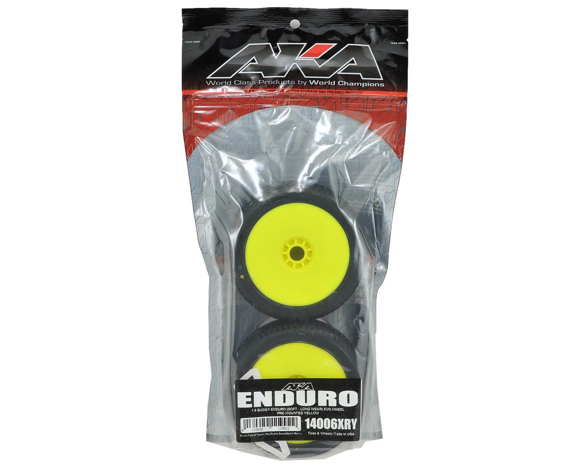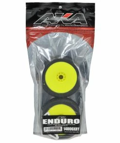 This is a set of two AKA Enduro 1/8th scale off-road buggy tires, pre-mounted on yellow EVO wheels. AKA’s R-Line pre-mounts feature AKA’s World Championship winning EVO wheel, and when combined with the stiffener disc (34003Y or 34003W), is the most technically advanced wheel available. The R-Line pre-mount also features AKA’s soft red insert (34001S) which was also used by Cody King to win the 2010-2011 1/8 Buggy IFMAR World Championships. Combine these two revolutionary products with the quality and endurance of AKA tires and the result is the most technically advanced pre-mounted tires ever offered for 1/8 Buggies.Â