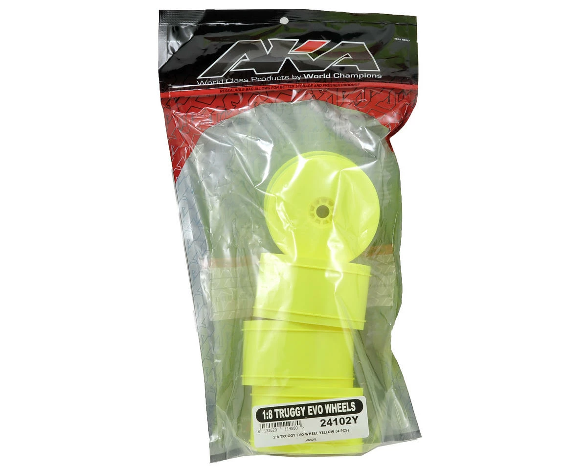 This is a set of four AKA Racing EVO 1/8 Truggy Standard Offset Wheels. The EVO Truggy wheel is modeled after the World Championship winning EVO Buggy wheel. The wheel features a convex face to help stiffen the wheel and add additional protection to the outside face. The EVO wheel has been designed with the new ROAR 1:8 Truggy wheel bead. This bead design is much simpler and promotes a stronger bond between the tire and wheel.