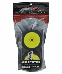 AKA EVO Zipps 1/8 Buggy Pre-Mounted Tires are designed with durability and stability in mind, perfect for today’s high wear and high grip tracks. The ZIPPS features a very dense symmetrical block tread pattern with a center staggered rib. The dense block pattern puts as much rubber on track as possible while still allowing dust to clear from the tire patch. This enables superior wear and stability while remaining controllable off line in the dust. The center rib decreases rolling resistance on the straights and creates a very stable platform in the center of the tire. AKA also updated the block design to allow for more deflection. This allows the block to flex a bit more front to rear to gain forward bite while still remaining stable side to side.