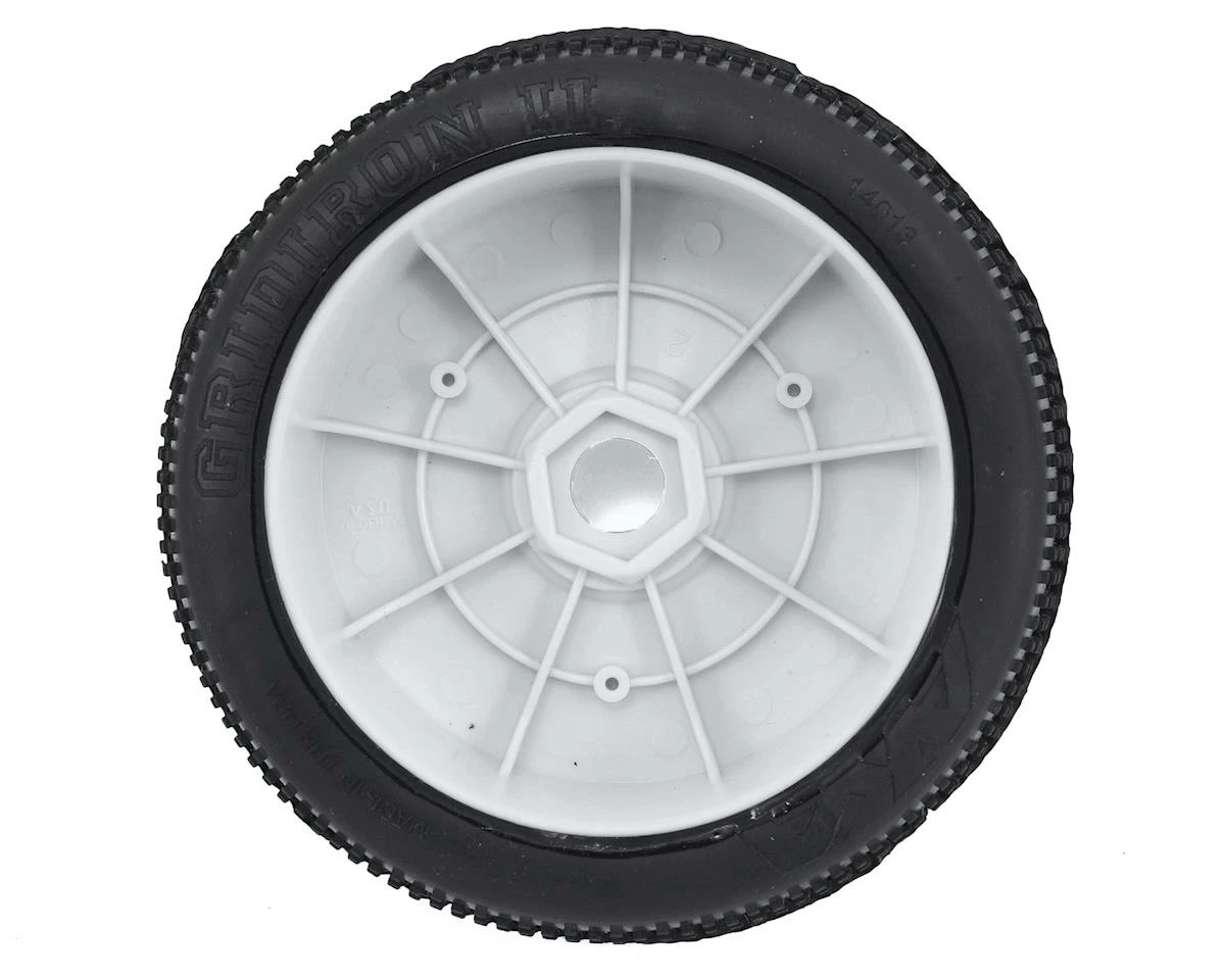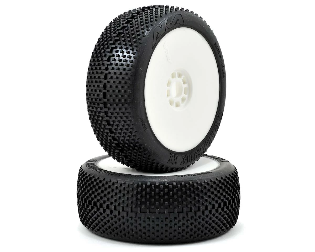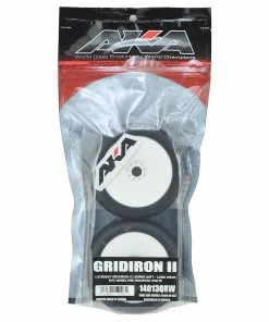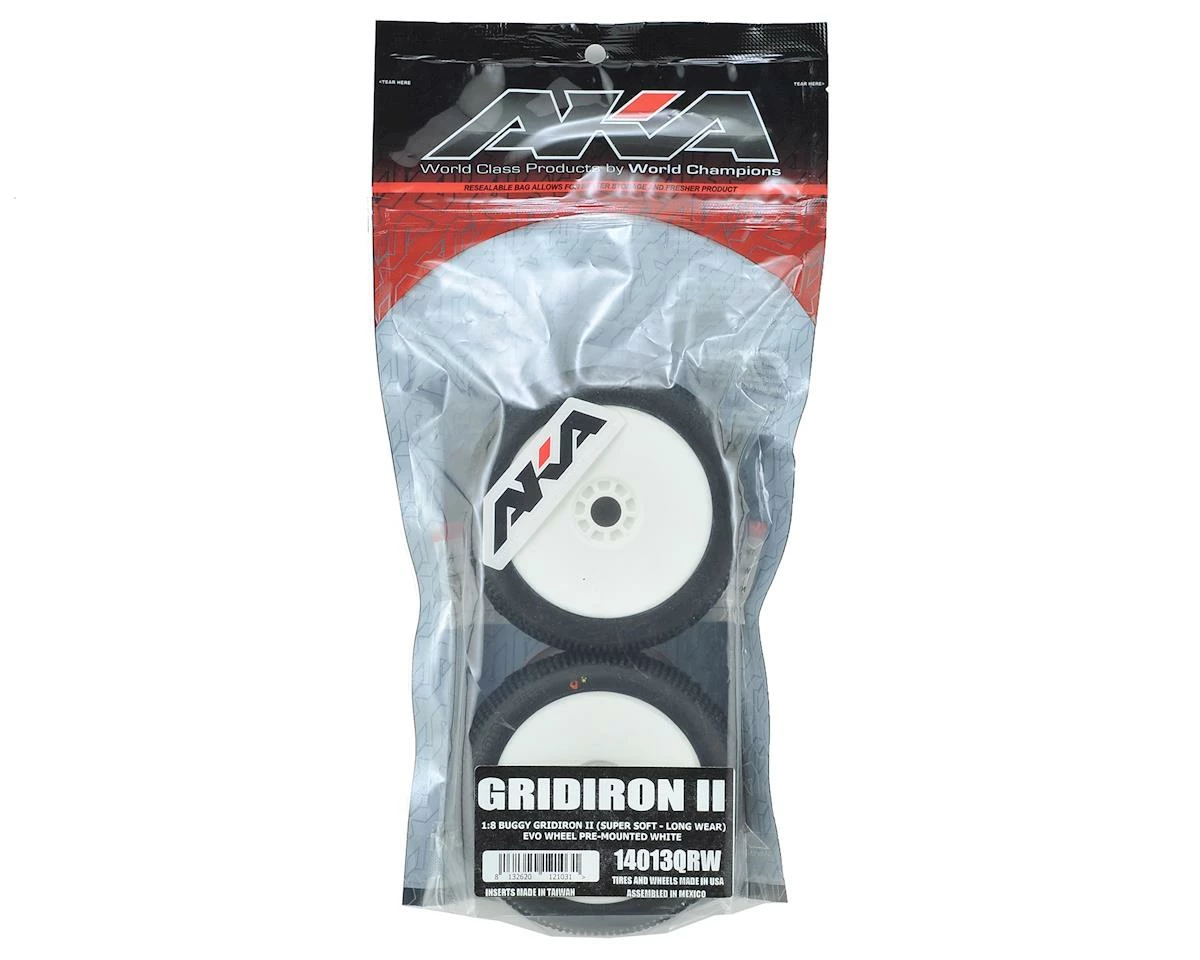 This is a set of two AKA Racing Grid Iron II 1/8 Scale Off-Road Buggy Tires, pre-mounted on white EVO wheels. The Grid Iron II uses the same carcass as the World Championship winning Impact tire, with the addition of added waffle ribbing to help control tire expansion and angled side pins for better performance on rougher tracks. This created a tire that is 5% lighter than the original, with improved improving acceleration and all-around performance.Â