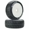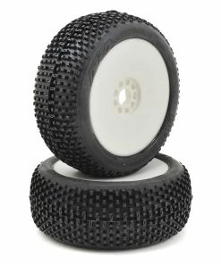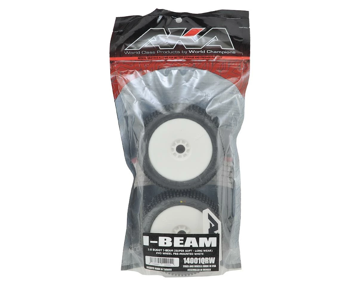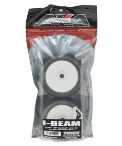 This is a set of two AKA I-Beam 1/8th scale off-road buggy tires, pre-mounted on white EVO wheels. AKA’s R-Line pre-mounts feature AKA’s World Championship winning EVO wheel, and when combined with the stiffener disc (34003Y or 34003W), is the most technically advanced wheel available. The R-Line pre-mount also features AKA’s soft red insert (34001S) which was also used by Cody King to win the 2010-2011 1/8 Buggy IFMAR World Championships. Combine these two revolutionary products with the quality and endurance of AKA tires and the result is the most technically advanced pre-mounted tires ever offered for 1/8 Buggies.Â