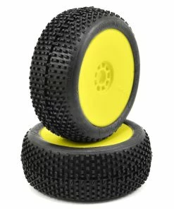 This is a set of two AKA I-Beam 1/8th scale off-road buggy tires, pre-mounted on yellow EVO wheels. AKA’s R-Line pre-mounts feature AKA’s World Championship winning EVO wheel, and when combined with the stiffener disc (34003Y or 34003W), is the most technically advanced wheel available. The R-Line pre-mount also features AKA’s soft red insert (34001S) which was also used by Cody King to win the 2010-2011 1/8 Buggy IFMAR World Championships. Combine these two revolutionary products with the quality and endurance of AKA tires and the result is the most technically advanced pre-mounted tires ever offered for 1/8 Buggies.Â