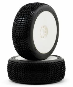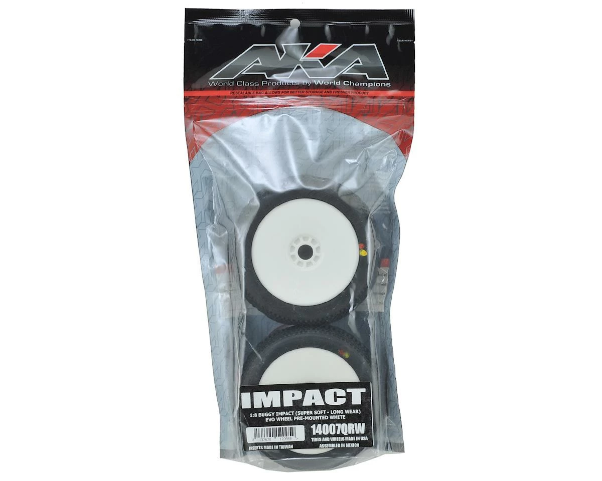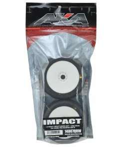 This is a set of two AKA Impact 1/8th scale off-road buggy tires, pre-mounted on white EVO wheels. AKA’s R-Line pre-mounts feature AKA’s World Championship winning EVO wheel, and when combined with the stiffener disc (34003Y or 34003W), is the most technically advanced wheel available. The R-Line pre-mount also features AKA’s soft red insert (34001S) which was also used by Cody King to win the 2010-2011 1/8 Buggy IFMAR World Championships. Combine these two revolutionary products with the quality and endurance of AKA tires and the result is the most technically advanced pre-mounted tires ever offered for 1/8 Buggies.Â