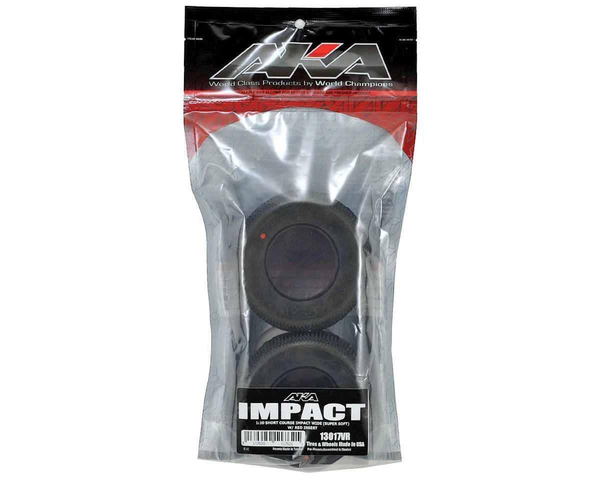 This is a pack of two AKA Racing Impact Wide Short Course Tires. The Impact is a medium sized lug that provides an unbelievable combination of long life and high performance. From hard packed high grip, to loose and loamy, the Impact will keep your truck firmly planted in the dirt.