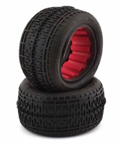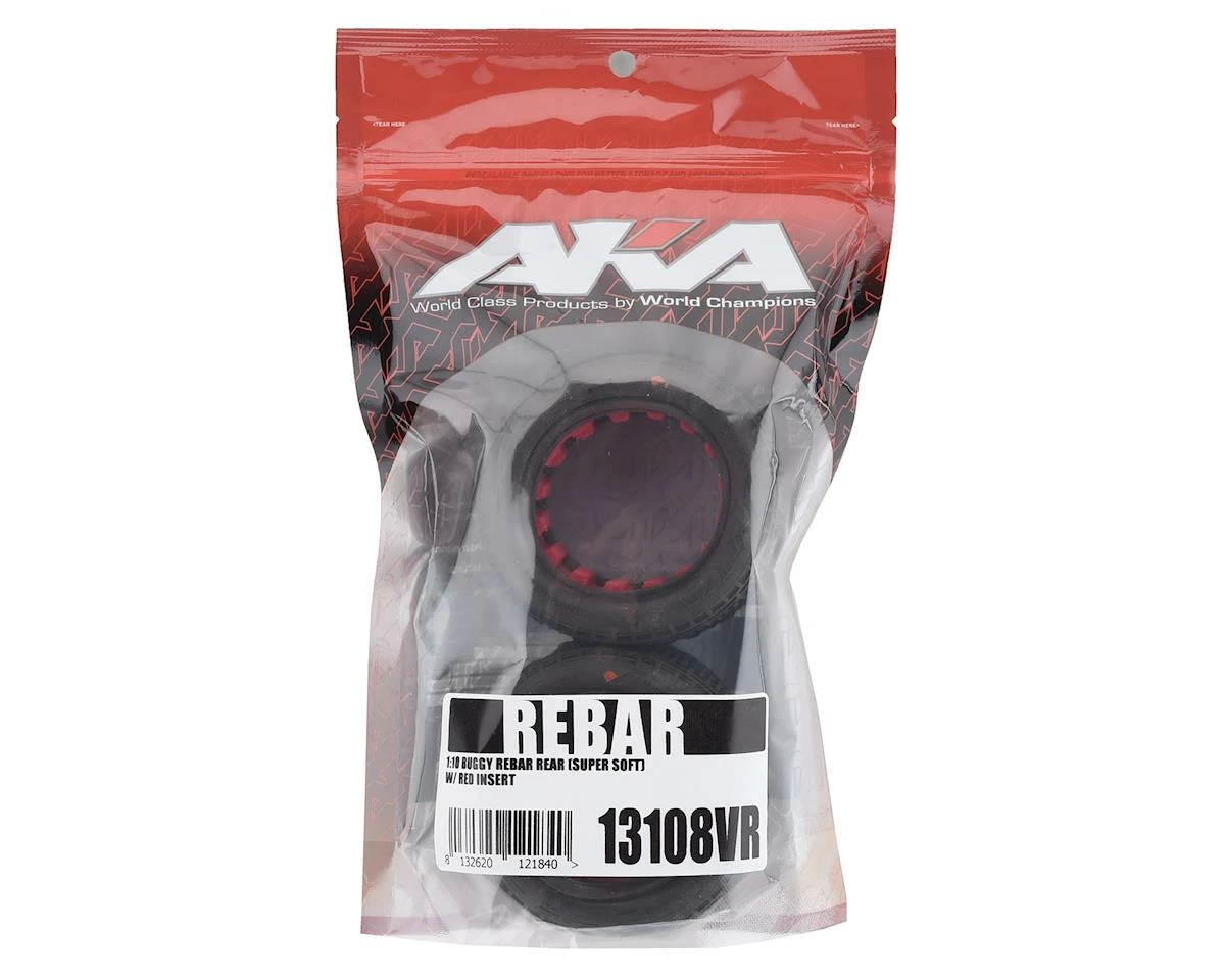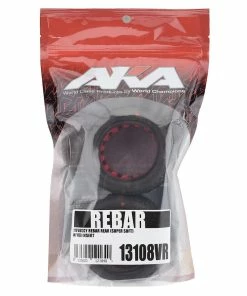 This is a pair of two AKA Racing Rebar 2.2 Rear Buggy Tires. These tires include red closed cell foam inserts. Mark Pavidis and Jared Tebo have teamed up to design AKA’s first 1/10 electric buggy tire, dubbed the REBAR. The REBAR has been developed for indoor tracks, as well as hard packed, bluegrooved outdoor tracks. The REBAR features double side rails on the edges of the tire that provide additional sidewall support, increasing side bite so your buggy stays planted in the turns. The wide staggered center lugs give the REBAR incredible forward traction to hook up the power and launch your buggy out of the corners and over jumps.