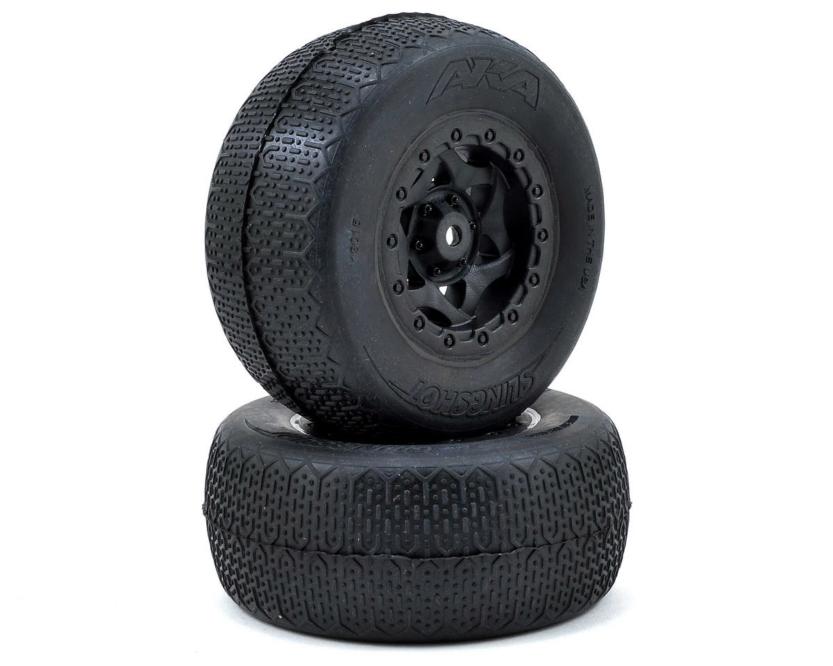 This is a pack of two AKA Racing Typo Wide Short Course Tires. These tires have been pre-mounted on black AKA Cyclone wheels that are intended for use with the Associated SC10 4×4. The Short Course Typo features a very low tread pattern that has been optimized for hard-packed indoor tracks. The “wide” carcass features a refined wide tread profile that delivers an exceptional balance between side and forward bite and will keep you moving through corners faster than ever! The Typo includes AKA Wide SC Red closed cell inserts and are designed, tested, and made in the USA!