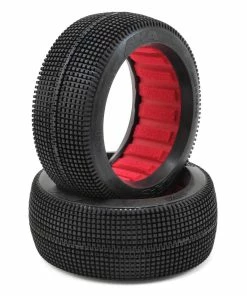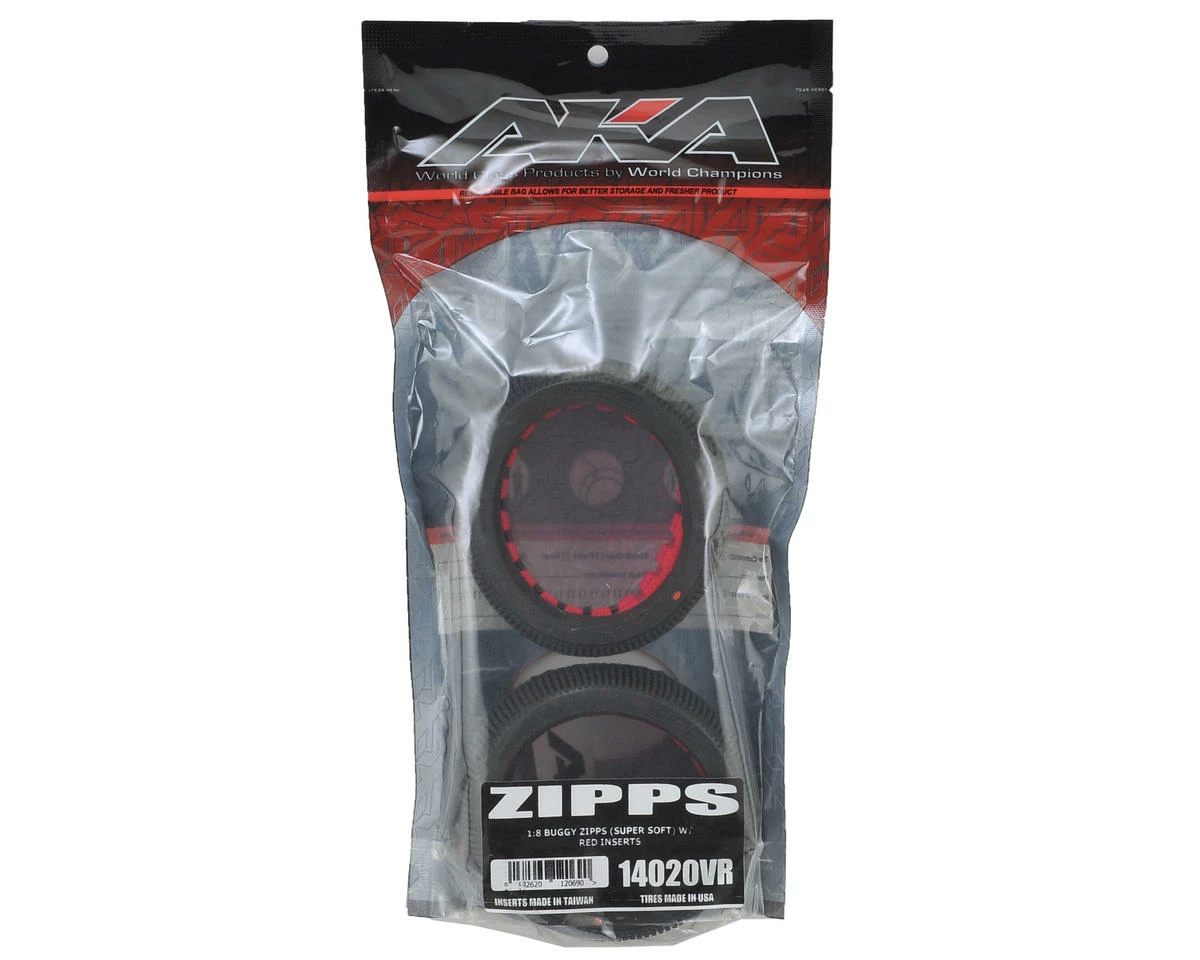 AKA Zipps 1/8 Buggy Tires were designed with durability and stability in mind. Zipps feature a dense symmetrical block tread pattern with a center staggered rib. The block pattern puts as much rubber on track as possible while still allowing dust to clear from the tire patch. This enables superior wear and stability while remaining controllable off line in the dust. The center rib decreases rolling resistance on the straights and creates a very stable platform in the center of the tire. The block design was updated to allow for more deflection, allowing the tire to flex a bit more front to rear to gain forward bite while still remaining stable side to side.