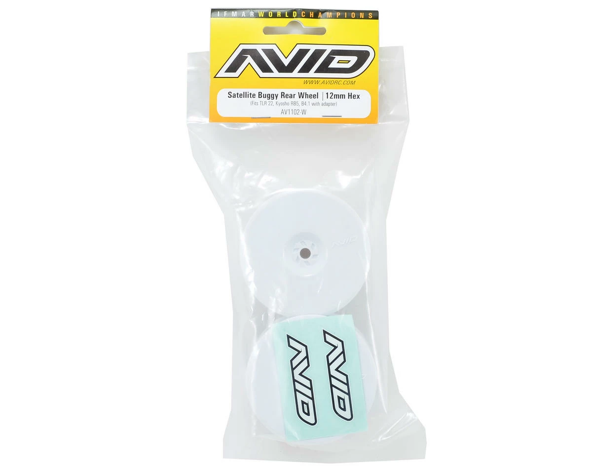 This is a pair of Avid RC 12mm Hex Satellite 2.2″ Rear Buggy Wheels. These wheels fit the rear of the Team Losi Racing 22, Kyosho RB5 and RB6 and the Team Associated B44.1 and B4.1 equipped with 12mm hex adapters (AVD1002-SET). Buggy racers around the world will appreciate the engineering, looks, and performance of the Satellite buggy wheel lineup from Avid.