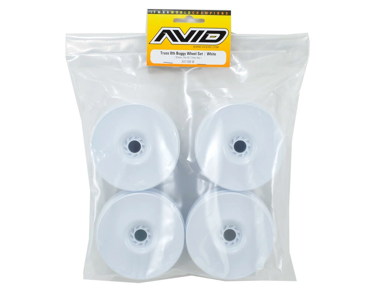 This is a pack of four white Avid “Truss” 83mm 1/8 Buggy Wheels. The way that the wheel affects the handling of your 1/8 buggy is often over looked. The Avid “Truss” 1/8 buggy wheel includes several unique features that provide the best performance and handling for your long and brutal main events!