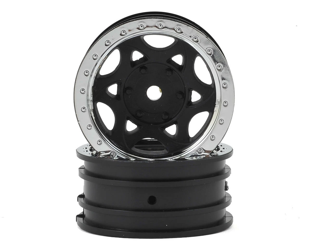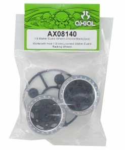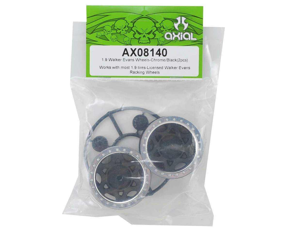 Axial 1.9 Walker Evans Street Wheels are officially licensed and molded from a blend of high quality nylon materials for strength and durability. These non beadlock wheels have a solid 12mm hex mount and have been dressed in black, with a chrome ring for eye catching looks. Package includes two wheels.