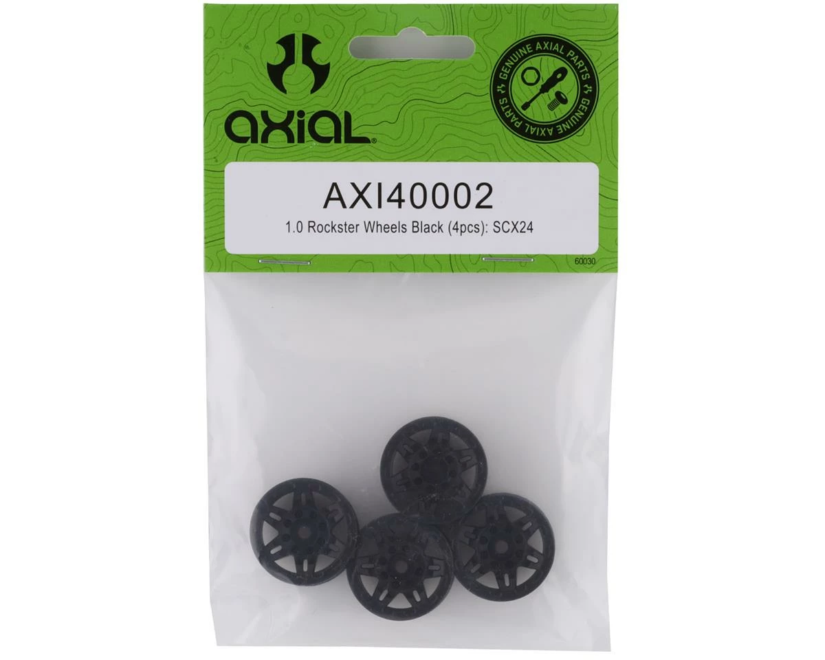 This is a pack of four Axial SCX24 1.0″ Black Rockster Wheels, intended for use with SCX24 Mini Crawler.