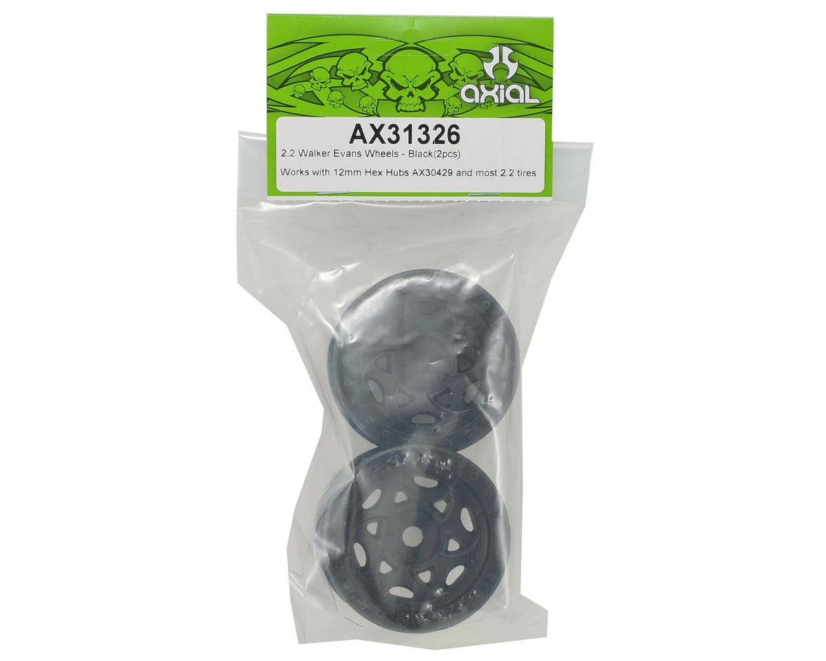 This is a pair of Axial 2.2 Walker Evans Wheels in Black color. Officially licensed Walker Evans Racing wheels are molded from a blend of high quality nylon materials for strength and durability with a solid 12mm hex mount and dressed in black for the stealthy race look.