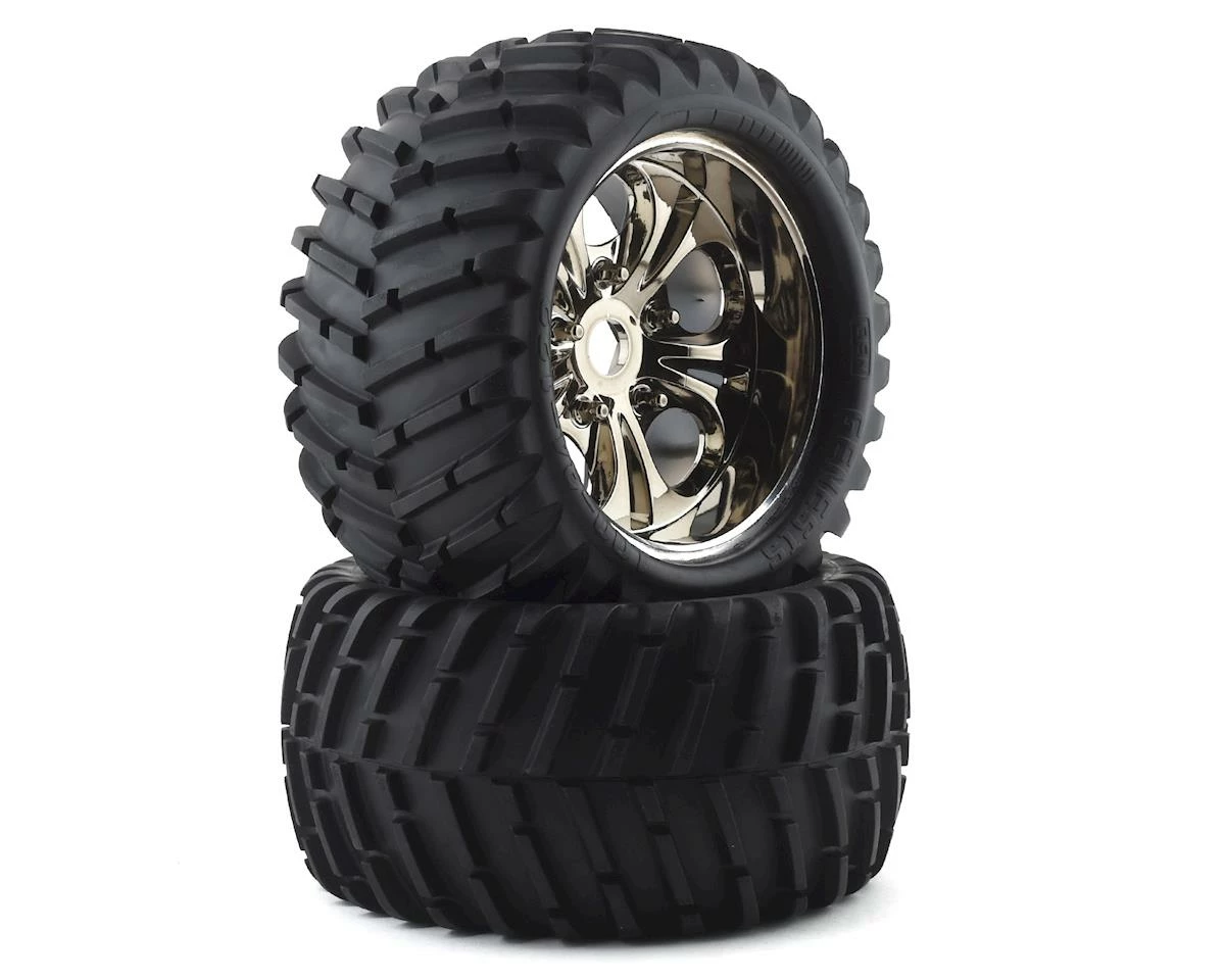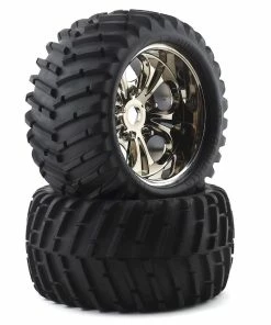 CEN Pre-Mounted V-Pattern Wheels & Tires. Package includes two replacement pre-mounted tires and wheels for the CEN Reeper and Colossus XT monster trucks.