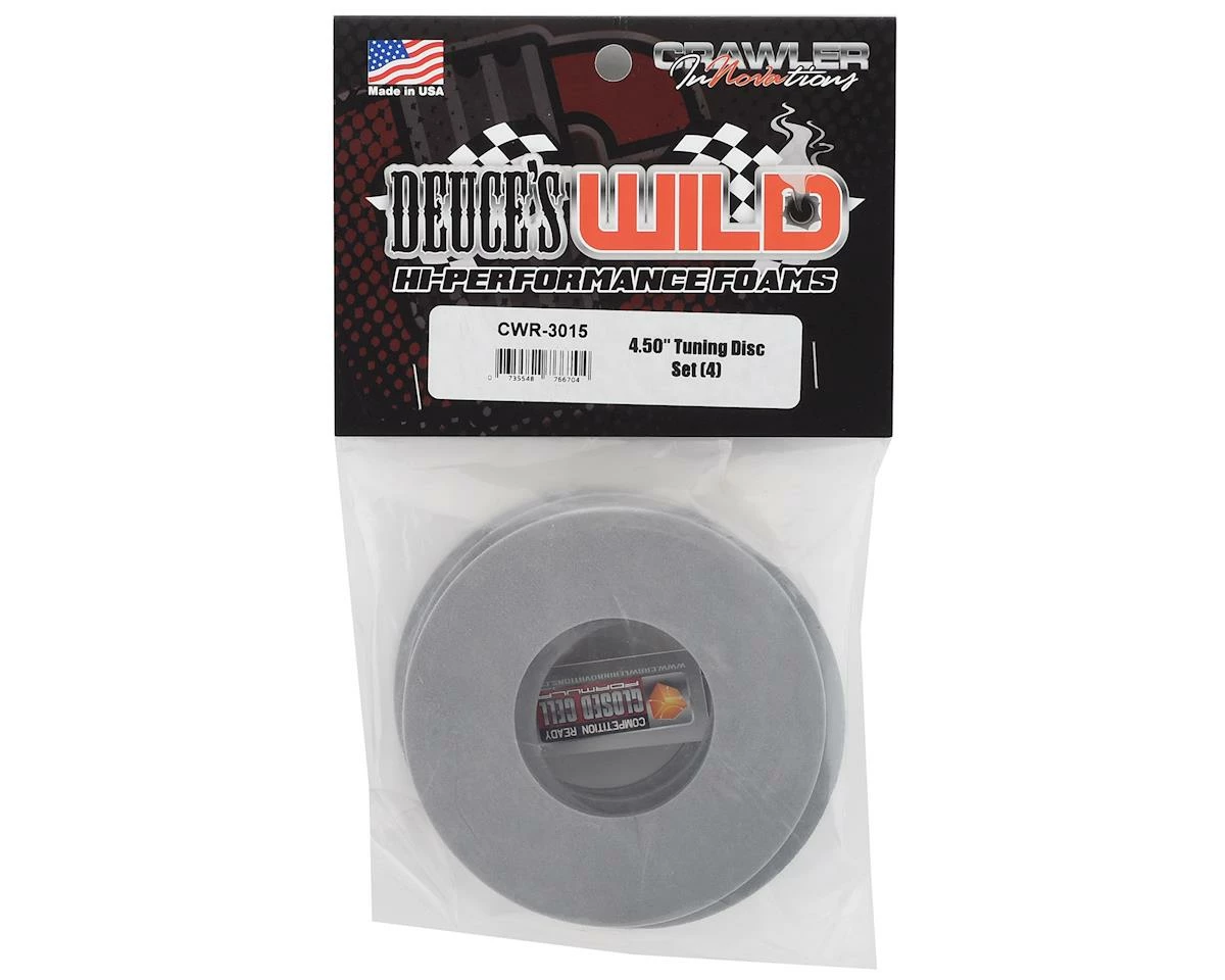 Crawler Innovations “Deuce’s Wild” 4.50″ Single Stage Tuning Discs are designed to add width to your foams inside the tire. Generally it is recommended to install one disc on the outside of all four tires. The discs do not fold over under load whether it’s high speed, heavy weight, or simply turning. The discs can easily be trimmed with scissors to reduce the O.D. or increase the I.D.