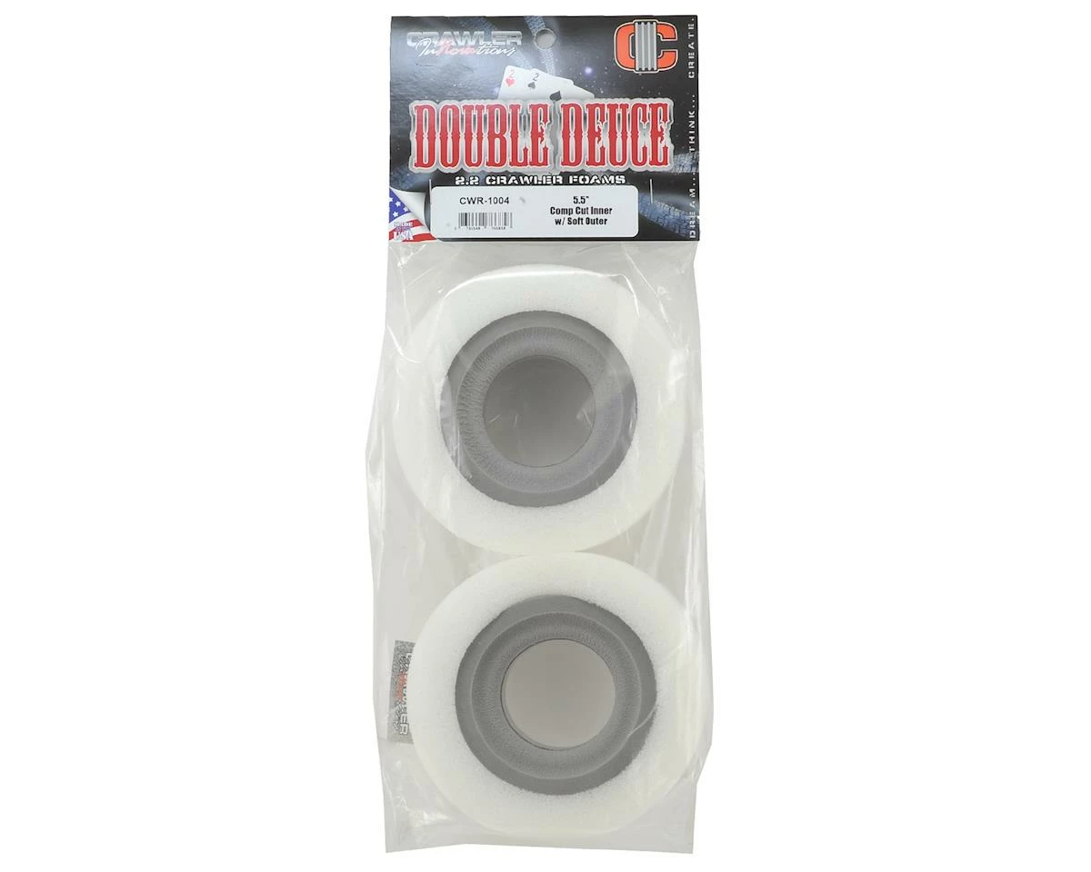 This is a pack of two Crawler Innovations Double Deuce 5.5 Crawler Tire Inserts. These inserts feature a comp cut inner foam, with a soft density outer foam. Crawler Innovations has brought a unique material and insert design to the crawler world that will dramatically improve the performance of your rig. The Double Deuce design features a closed cell inner foam combined with a conventional outer foam insert. The closed cell inner foam is super dense, water proof, is not temperature sensitive and is extremely durable. The conventional outer foam is not temperature sensitive, but it is not water proof.