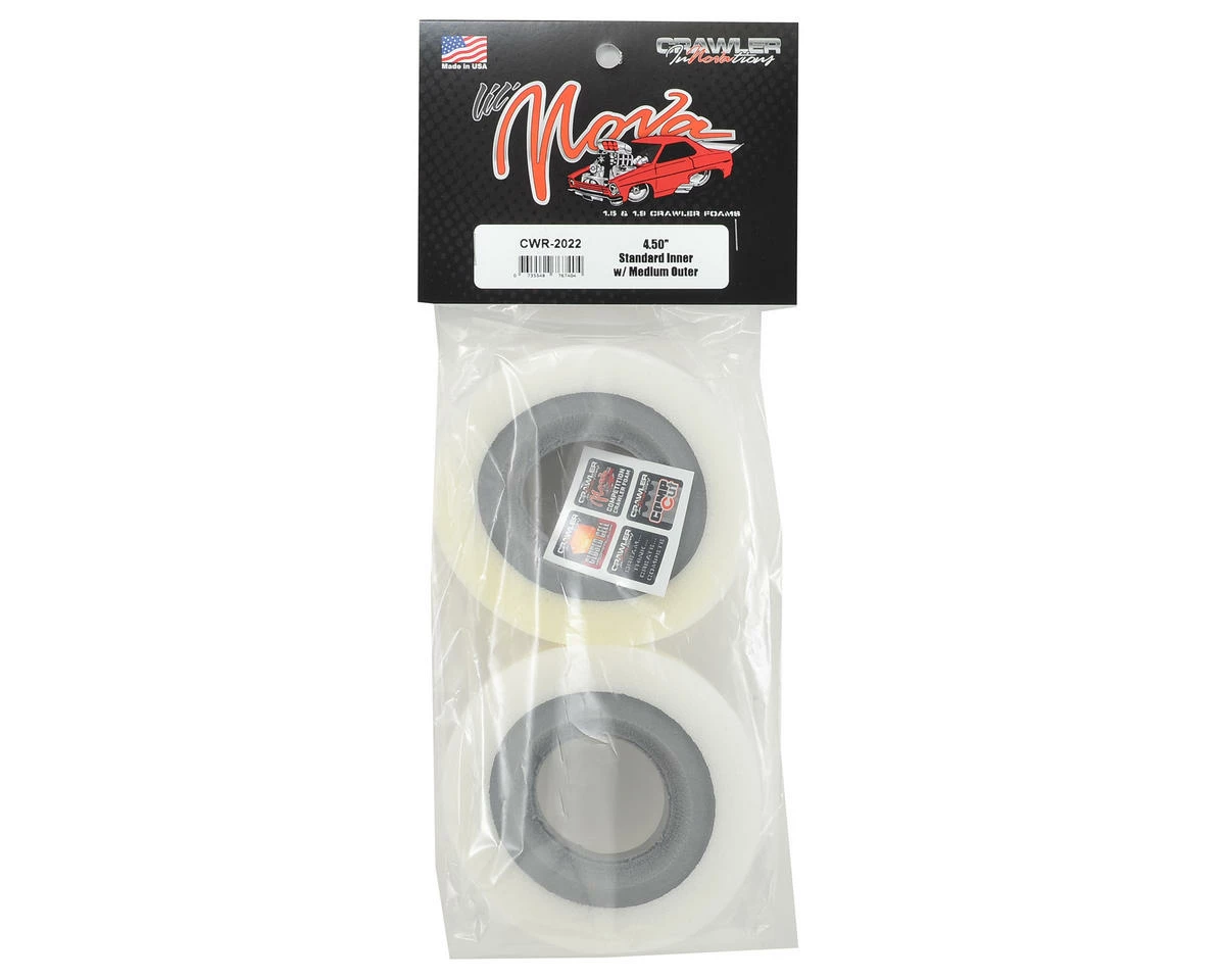 This is a pack of two Crawler Innovations Lil’ Nova 1.9 x 4.50″ Dual Stage Crawler Tire Inserts. These inserts feature a standard inner foam, with a Medium density outer foam. Crawler Innovations has brought a unique material and insert design to the crawler world that will dramatically improve the performance of your rig. The Lil’ Nova design features a closed cell inner foam combined with a conventional over sized outer foam insert. The closed cell inner foam is super dense, water proof, is not temperature sensitive and is extremely durable. The conventional outer foam is not temperature sensitive, but it is not water proof.