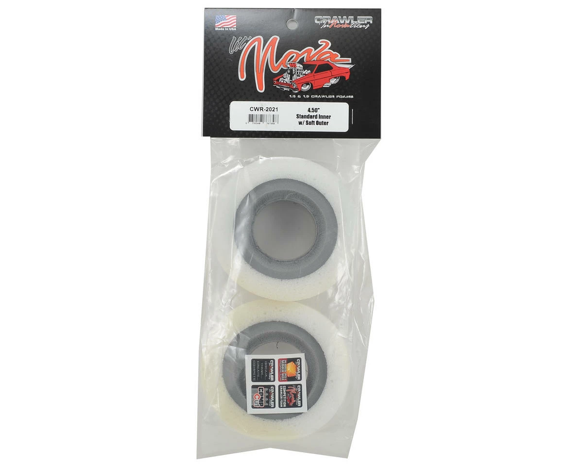 The 4.5 Size is the recommended for scalers weighing 6 – 8 pounds using tires 4.375″ to 4.625″ Tall. The Standard Inner Foam Width fits 1″ wide bead lock wheels and the outer foam is Over-Sized on purpose to encase the closed cell inner, and to provide for weight support.