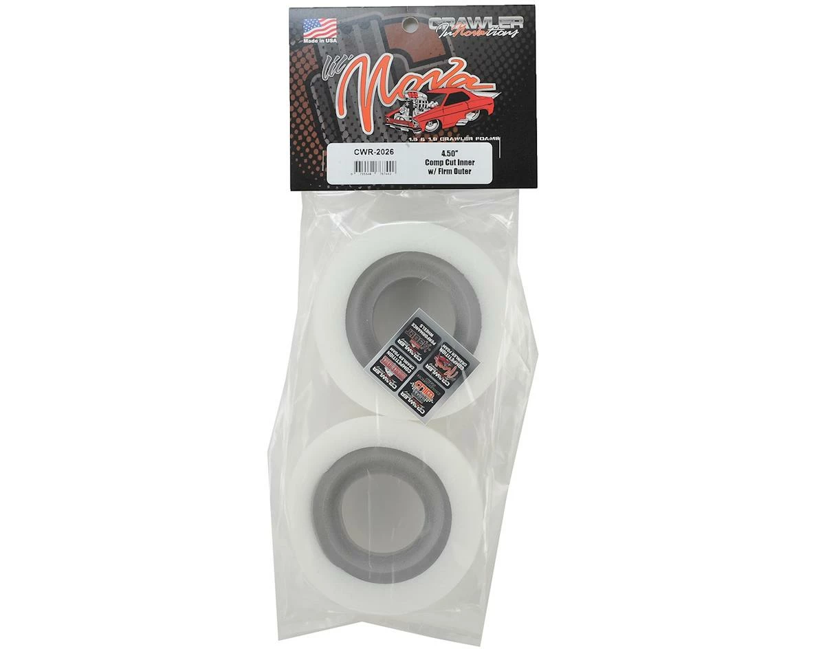 This is a pack of two Crawler Innovations Lil’ Nova 4.5″ Dual Stage Crawler Tire Inserts. These inserts feature a comp cut inner foam, with a firm density outer foam. Crawler Innovations has brought a unique material and insert design to the crawler world that will dramatically improve the performance of your rig. The Lil’ Nova design features a closed cell inner foam combined with a conventional over sized outer foam insert.