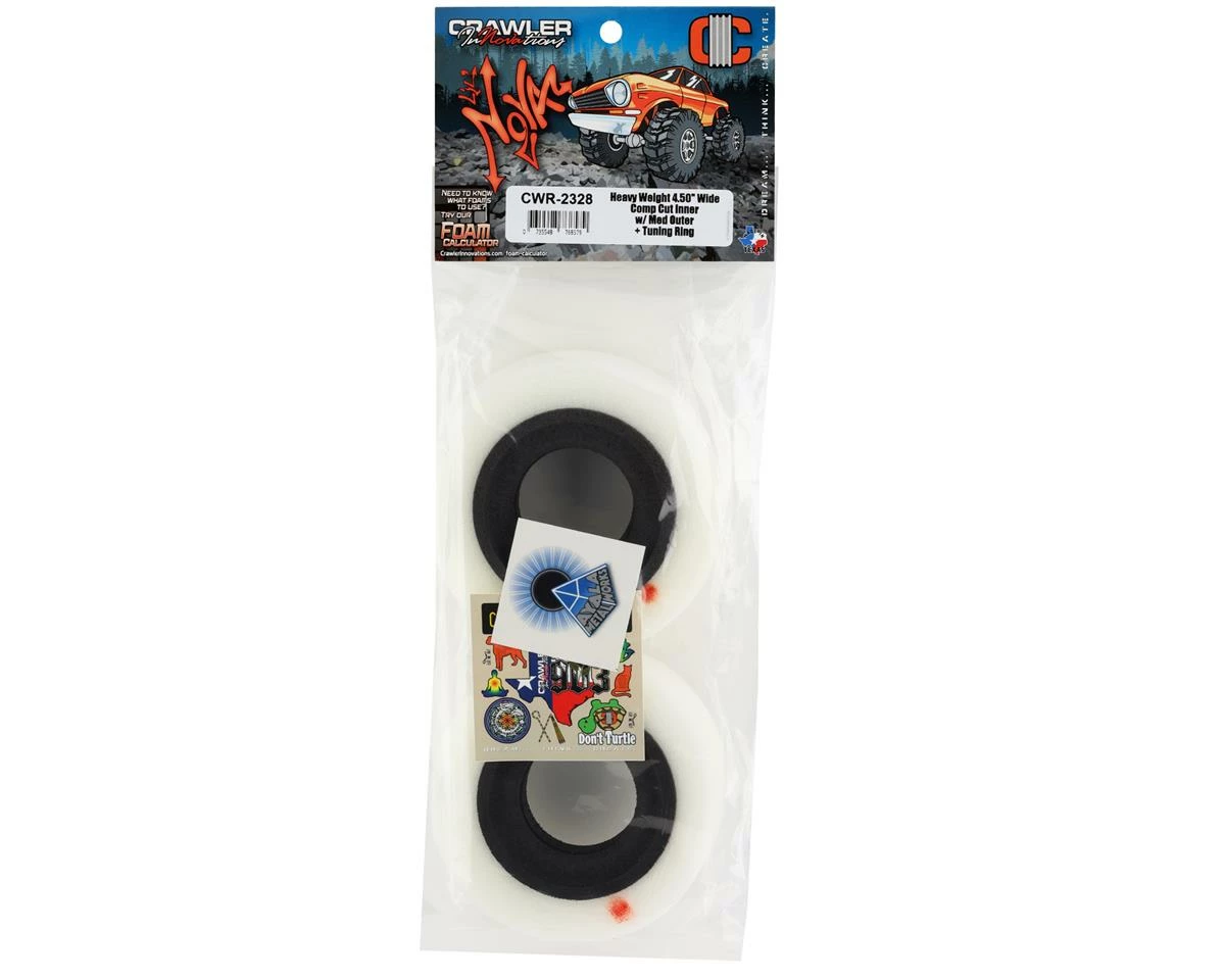 Crawler Innovations Lil’ Nova Heavy Weight Dual Stage 4.50” 1.9 Wide Crawler Foam. Crawler Innovations has brought a unique material and insert design to the crawler world that will dramatically improve the performance of your rig. The Lil’ Nova design features a closed cell inner foam combined with a conventional over sized outer foam insert. This gives you excellent steering response and minimal tire rollover while still providing a softer outer foam to help the tire conform to the environment.
