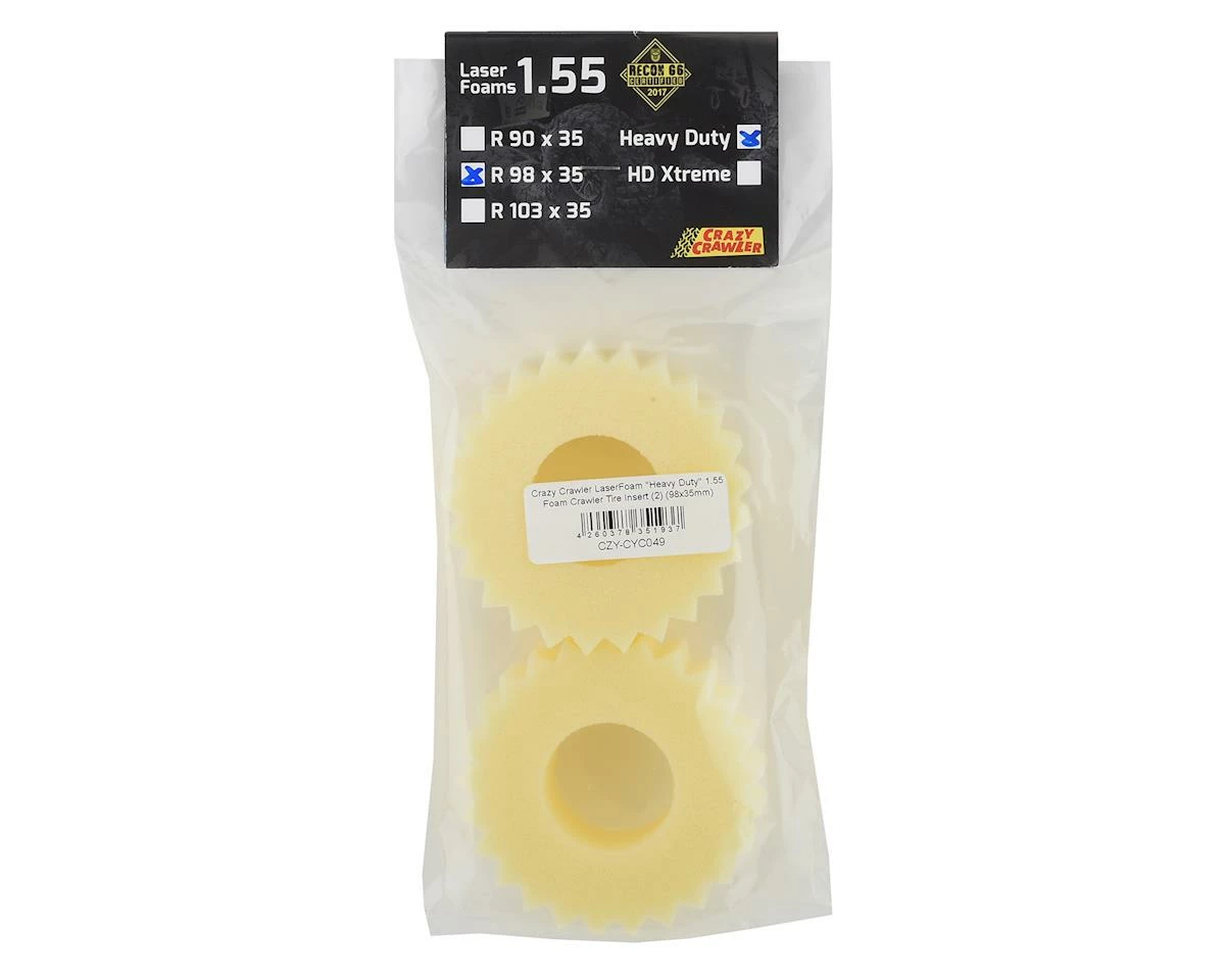 Crazy Crawler LaserFoam “Heavy Duty 98×35” 1.55 Foam Crawler Tire Inserts are precision cut open cell foam tire inserts designed for performance. LaserFoam inserts offer incredible lateral stability and sidewall support, yet still remain nice and soft on the contact patch. The material and cut shape ensure that the tire only rolls in the area of the tread that is in contact with the surface, creating great driving characteristics and an incredibly scale look. Plus, the soft open cell foam material allows the insert to fit even when internal weight is added.