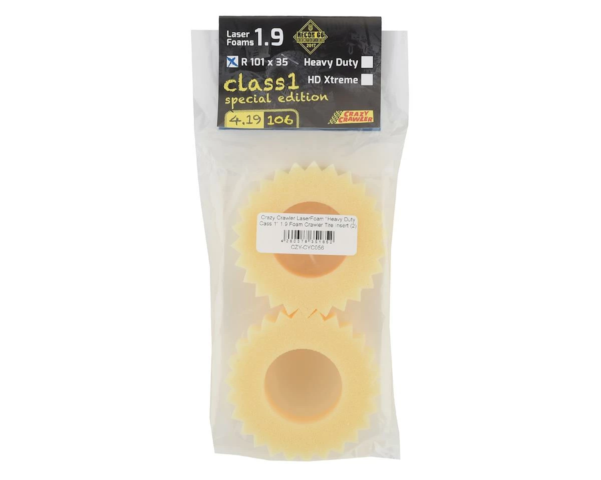 Crazy Crawler LaserFoam “Heavy Duty Class 1” 1.9 Foam Crawler Tire Inserts are precision cut open cell foam tire inserts designed for performance. LaserFoam inserts offer incredible lateral stability and sidewall support, yet still remain nice and soft on the contact patch. The material and cut shape ensure that the tire only rolls in the area of the tread that is in contact with the surface, creating great driving characteristics and an incredibly scale look. Plus, the soft open cell foam material allows the insert to fit even when internal weight is added.