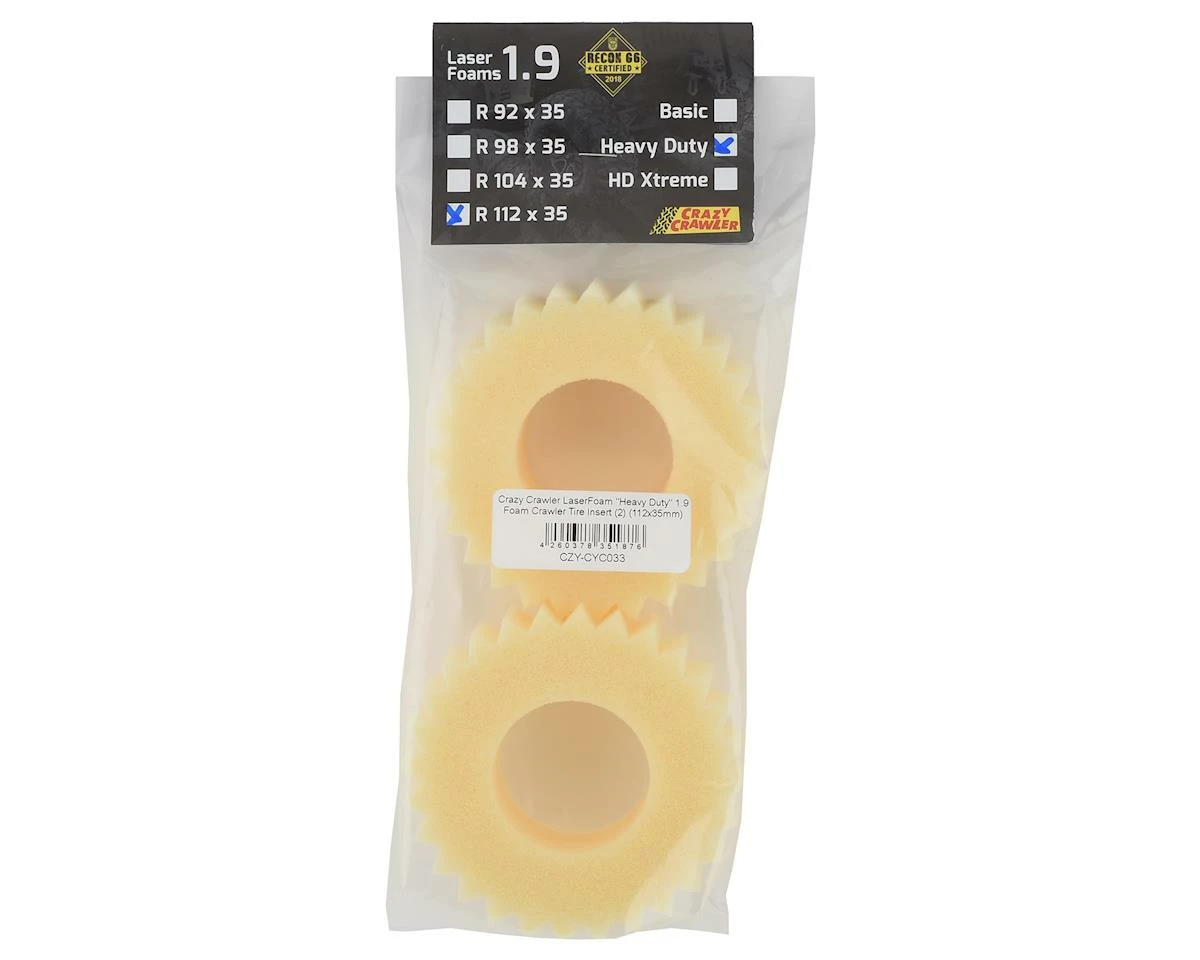 Crazy Crawler LaserFoam “Heavy Duty 112×35” 1.9 Foam Crawler Tire Inserts are precision cut open cell foam tire inserts designed for performance. LaserFoam inserts offer incredible lateral stability and sidewall support, yet still remain nice and soft on the contact patch. The material and cut shape ensure that the tire only rolls in the area of the tread that is in contact with the surface, creating great driving characteristics and an incredibly scale look. Plus, the soft open cell foam material allows the insert to fit even when internal weight is added.