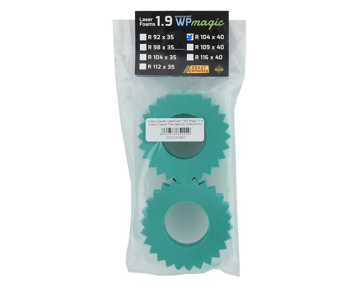 Crazy Crawler LaserFoam “WP Magic 104×40” 1.9 Foam Crawler Tire Inserts are precision cut, waterproof, closed cell foam tire inserts designed for performance. The unique closed cell material clings to the tire, and this direct connection helps to reduce internal movement of the insert, helping to increase stability. The material and cut shape ensure that the tire only rolls in the area of the tread that is in contact with the surface, creating great driving characteristics and an incredibly scale look. Â