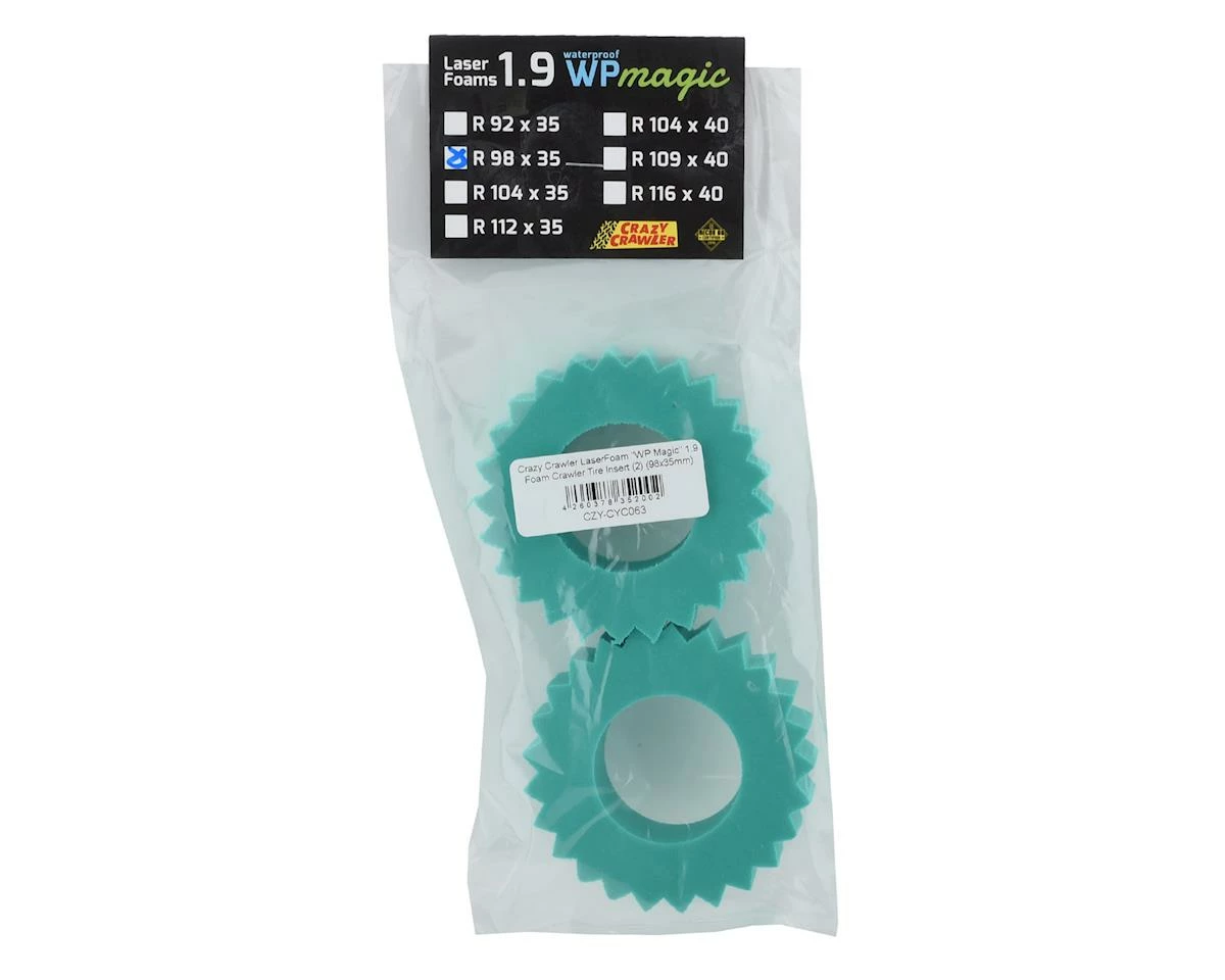 Crazy Crawler LaserFoam “WP Magic 98×35” 1.9 Foam Crawler Tire Inserts are precision cut, waterproof, closed cell foam tire inserts designed for performance. The unique closed cell material clings to the tire, and this direct connection helps to reduce internal movement of the insert, increasing overall stability. The material and cut shape ensure that the tire only rolls in the area of the tread that is in contact with the surface, creating great driving characteristics and an incredibly scale look. Â