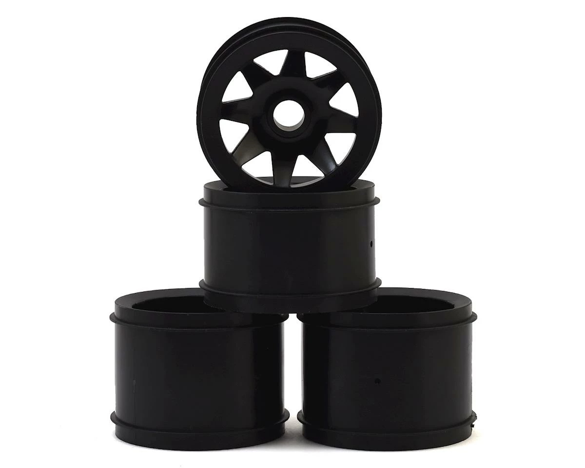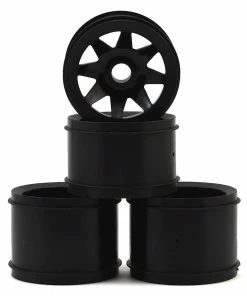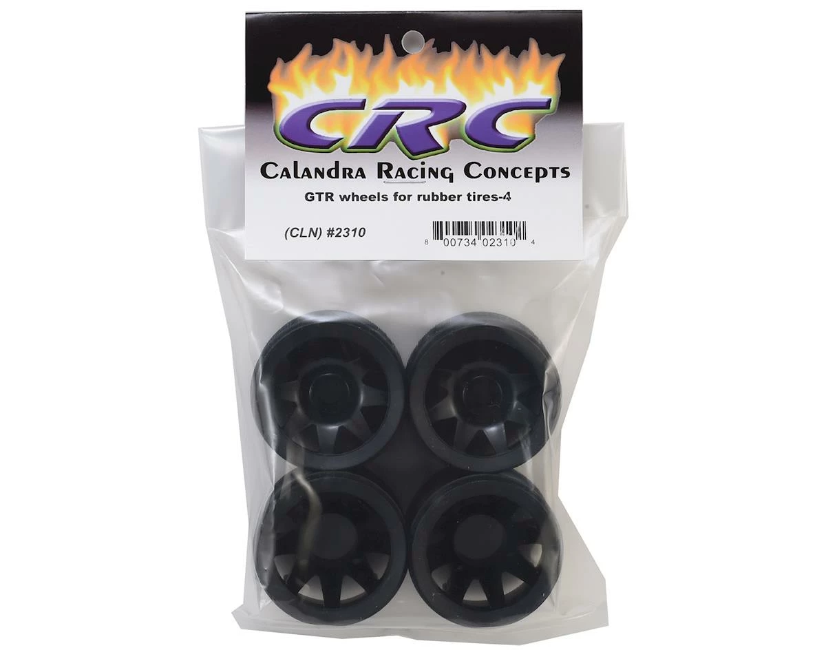 CRC GTR Rubber Tire Wheels are designed for rubber tire 1/10th scale pan car racing, both oval and road. They are direct bolt on for 1/10th cars. In the rear, they use the standard 4 bolt mounting pattern commonly used in oval and World GT. In the front, they use the normal 1/8 x 5/16″ bearing, again very common among the 1/10th oval and World GT cars. The mounted tires measure around 2.45″ diameter, most all pan cars can be adjusted to make the proposed 5mm ride height rule. These rims are designed to mount the best performing tires on the market; the Pit Shimizu, Tamiya TCS and CRC RT1. The rims are designed for 2 types of scale looks; low profile (sidewall) GT type cars and large sidewall NASCAR and F1 scale looks. Standard offset makes it easy to mount and go!