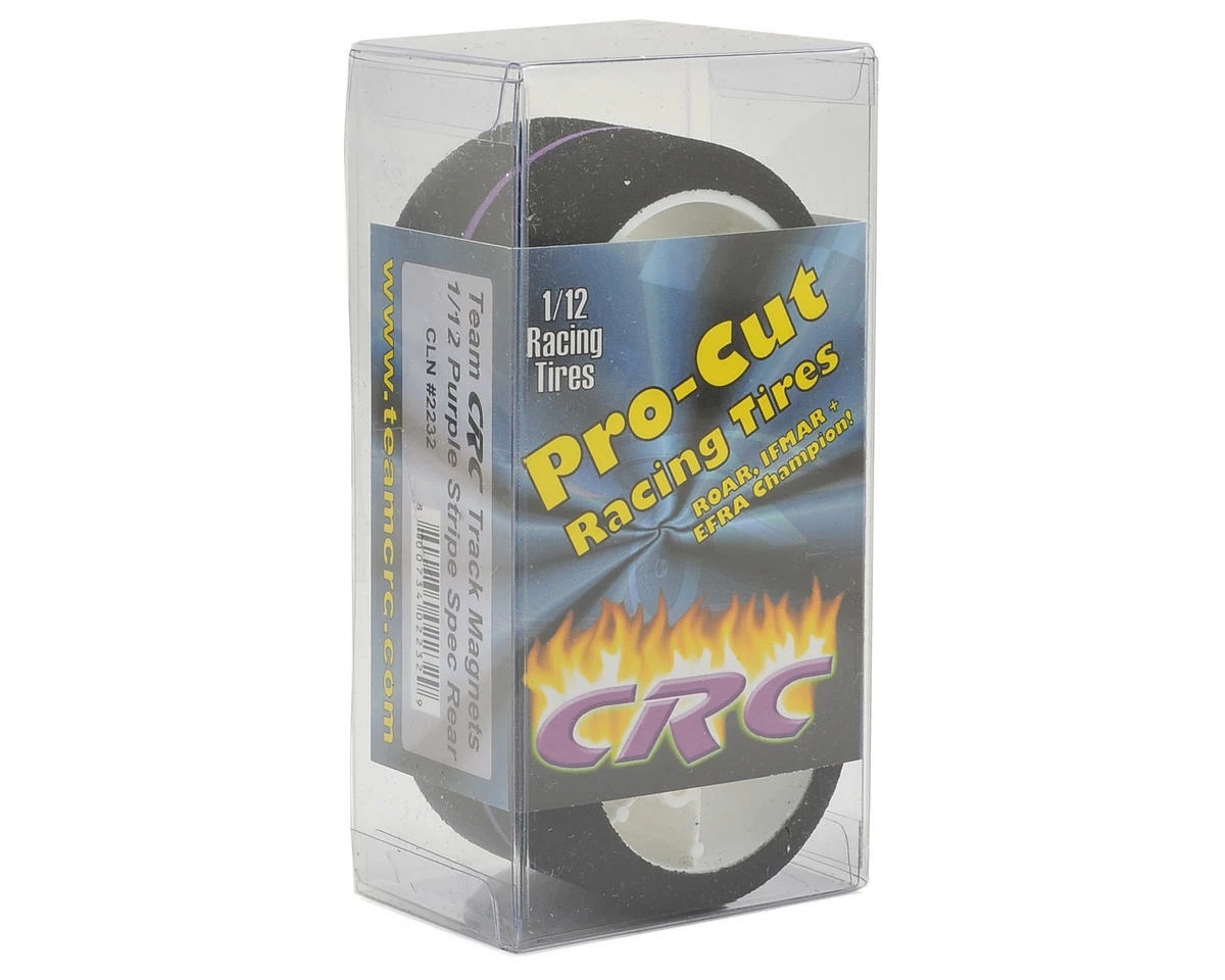 Calandra Racing “WGT Stripe” 1/12 Spec Rear Tires use the same purple stripe compound foam used for 1/10 World GT spec racing. This is the compound required by TOUR rules for the 1/12 Truck class, and is being used by some road course clubs as a “control tire” class as well! Mounted on “High Roller 38″ large diameter HR-38 rims, Pro-Cut tires are low profile race tires, and trued to 1.90” rear.