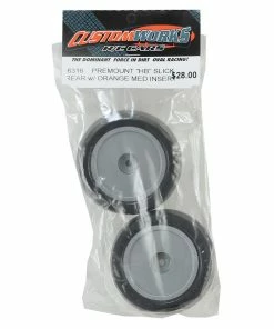 Custom Works Slick Pre-Mounted Rear Tires. These tires are available in standard and soft “HB” compounds and are pre-mounted on standard Custom Works 2.0″ rubber tire wheels with orange medium inserts. Package includes two rear tires.