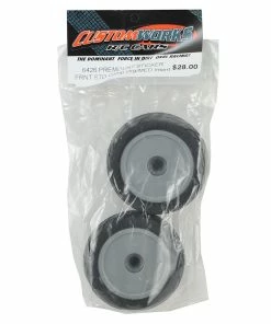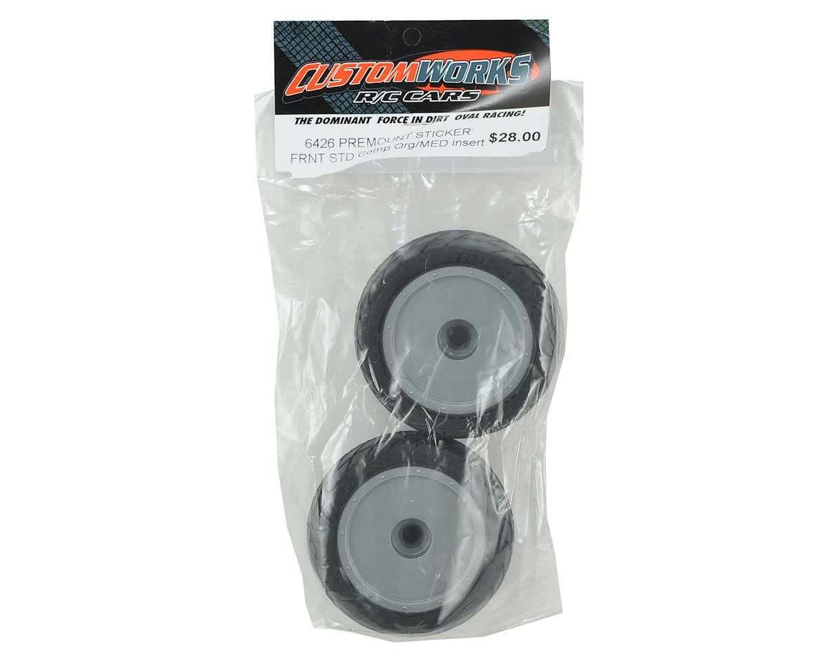 Custom Works Sticker Pre-Mounted Dirt Oval Front Tires. These tires are available in standard and soft “HB” compounds and are pre-mounted on standard Custom Works 2.0″ rubber tire wheels with orange medium inserts. Package includes two front tires.