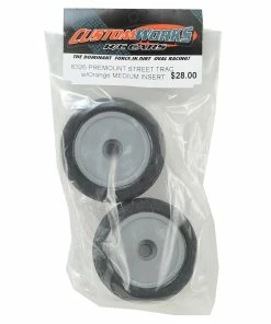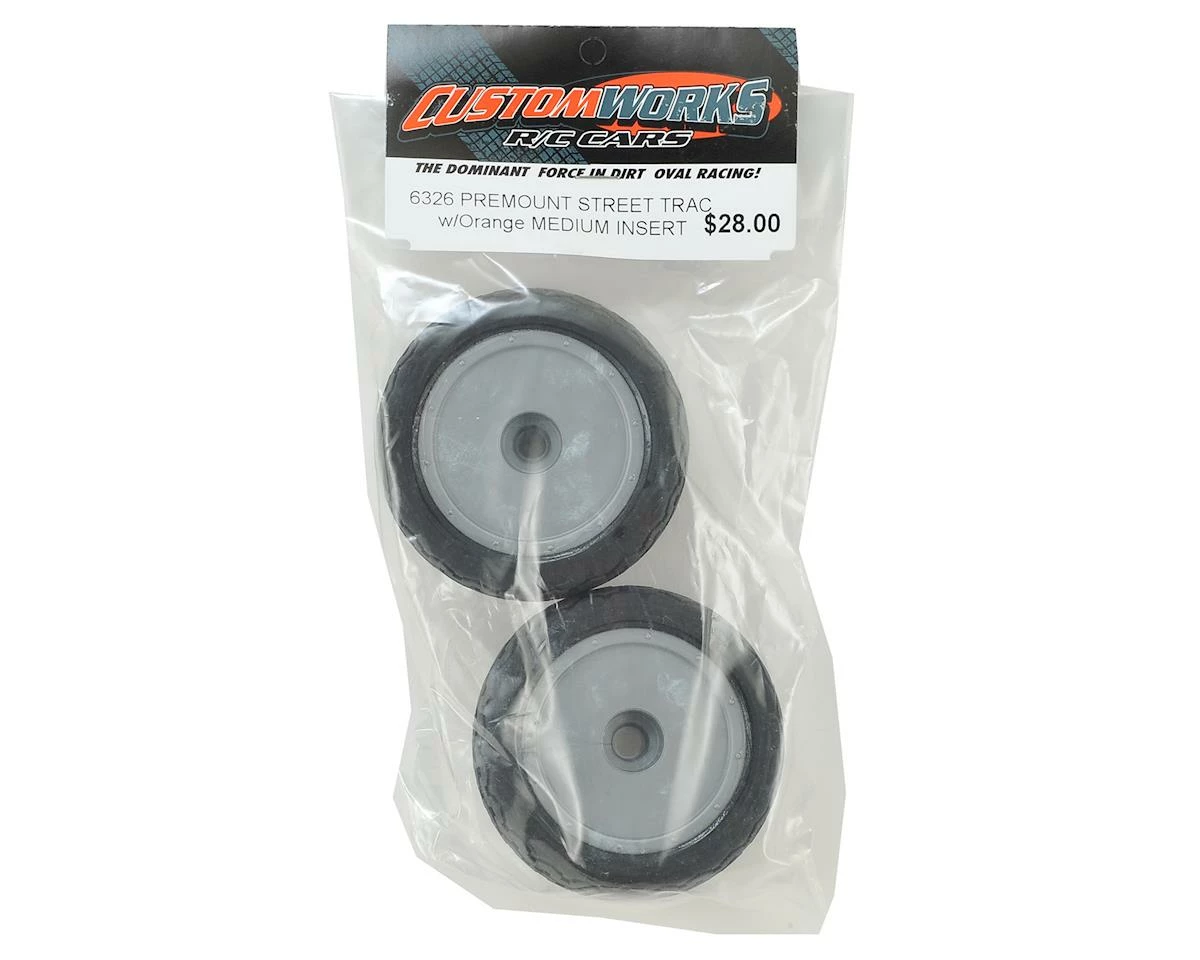 Custom Works Street Trac Pre-Mounted Dirt Oval Front Tires. These tires are available in standard and soft “HB” compounds and are pre-mounted on standard Custom Works 2.0″ rubber tire wheels with orange medium inserts. Package includes two front tires.