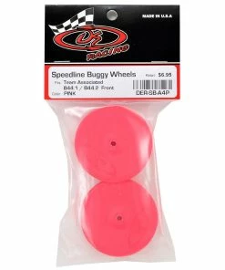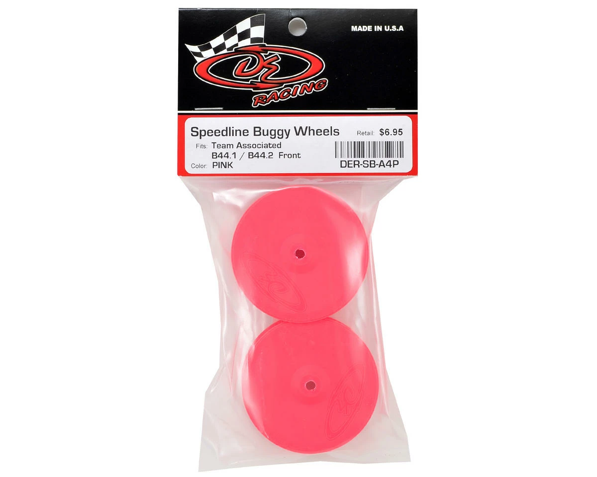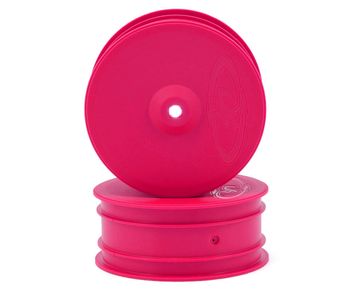 This is a pack of two Pink DE Racing “Speedline” 2.2 4WD Front Buggy Wheels. Blending a traditional style dish wheel to the precision and durability DE Racing is known for, the Speedline series wheels make a statement to the racing community even larger than the logo on the face. Features include a channel for easier tire gluing, start holes for optional venting, and improved wheel flex to optimize traction and handling.