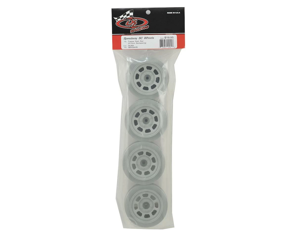These DE Racing Speedway Short Course Wheels have a 21.5mm backspacing, and fit the rear of the Traxxas Slash, and any other truck that uses Traxxas Slash rear offset wheels.