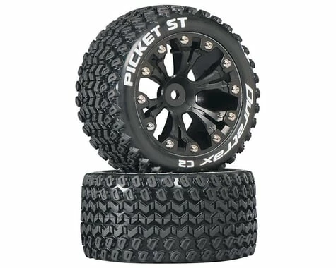 Duratrax 2.8″ diameter stadium truck tires are available mounted in your choice of black or chrome 6-spoke rims. All are sold in pairs and include foam inserts.
