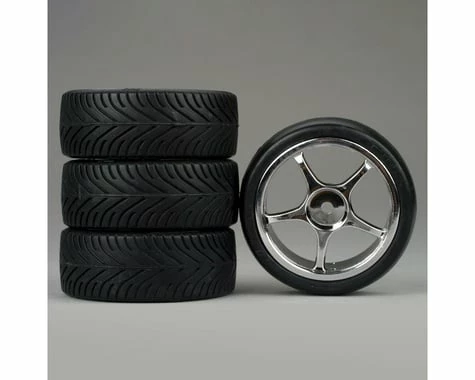 This is a pack of four DuraTrax Radial 1/10 Scale Tires pre-mounted on 5-Spoke Chrome Wheels. These tires are mounted and ready to go, with a 12mm hex for easy fitment on the front or rear of your TC car.Â