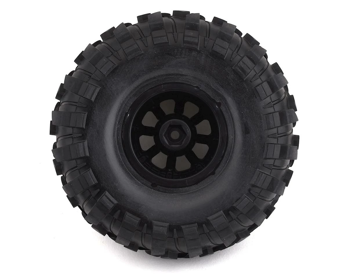 This is a set of Duratrax Showdown CR Mounted 2.2″ Crawler Tires. These tires are mounted on split spoke black and chrome wheels. All are sold in pairs and include foam inserts.Â