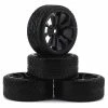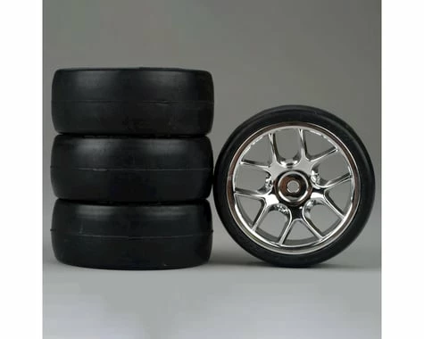 This is a pack of four DuraTrax Slick 1/10 Scale Tires pre-mounted on 5-Spoke Chrome Wheels. These tires are mounted and ready to go, with a 12mm hex for easy fitment on the front or rear of your TC car.Â
