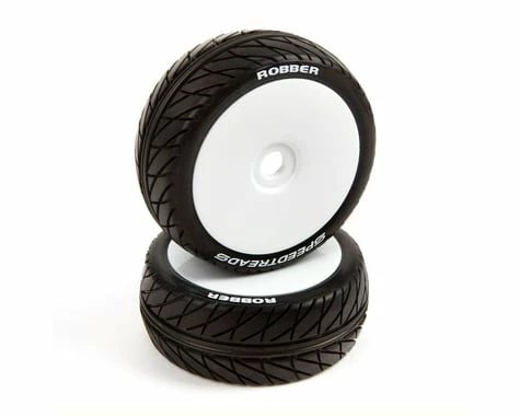 This is a pack of two DuraTrax SpeedTreads Robber 1/8 On-Road Buggy Tires, pre-mounted to white wheels featuring a 17mm hex.