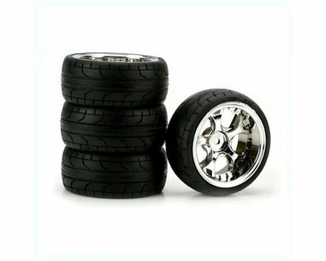 This is a pack of four DuraTrax ST Radial 1/10 Scale Tires pre-mounted on 5-Blade Chrome Wheels. These tires are mounted and ready to go, with a 12mm hex for easy fitment on the front or rear of your TC car.Â
