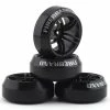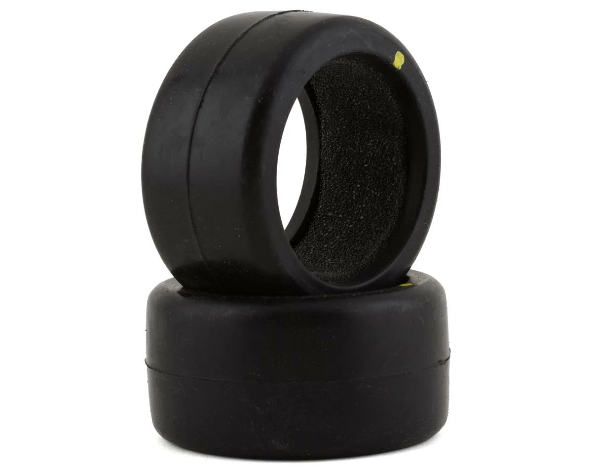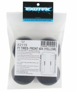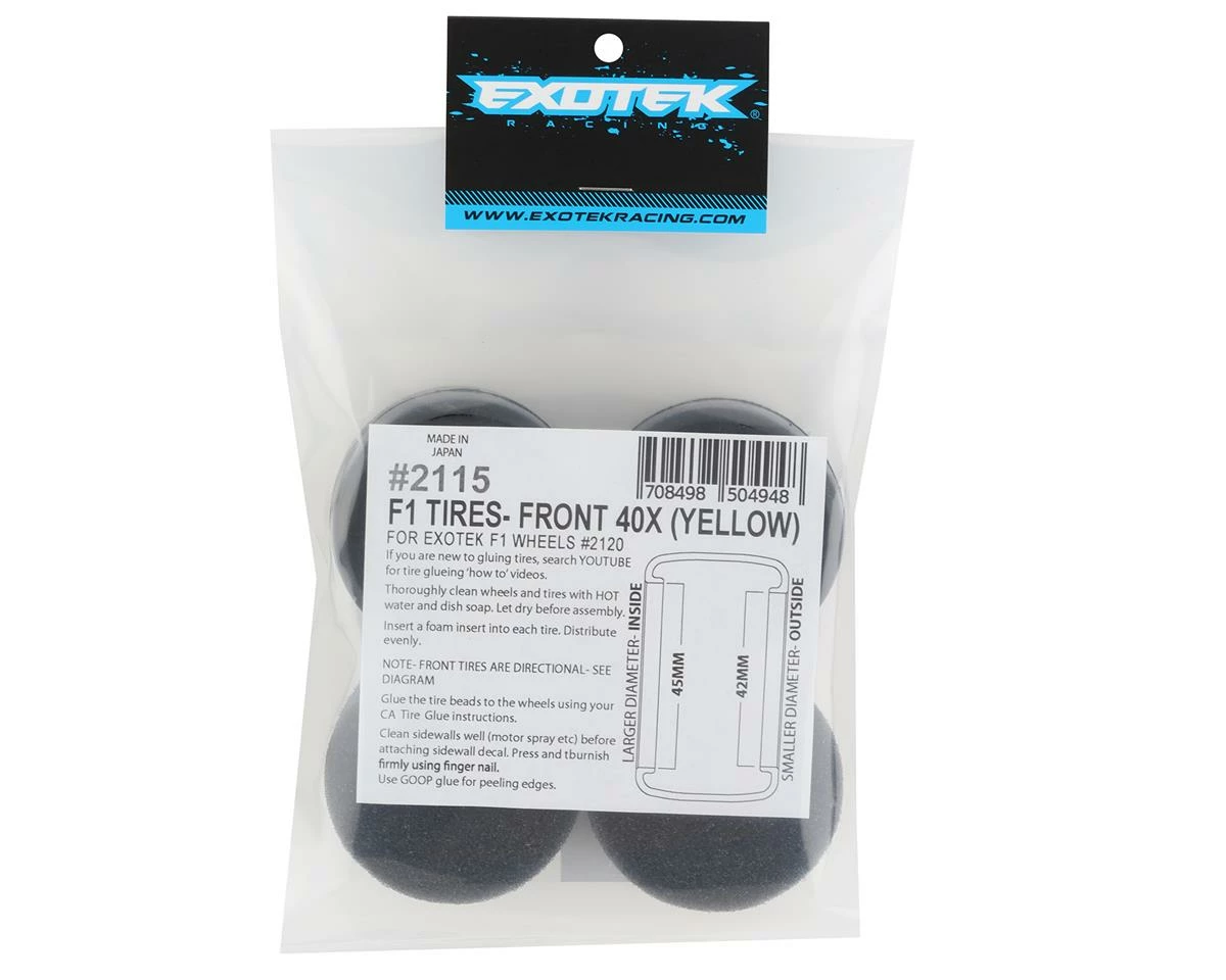 The Exotek F1 Front Rubber Tires bring full size F1 styling and performance to the F1 tire segment. Designed from the ground up Exotek has taken the best elements of RC F1 tires and incorporate this into these rubber tires. These front tires are designed with a wide profile for maximum contact patch while the sidewalls are designed with 2 different sidewall diameters. The larger inner diameter serves two purposes, first this gives more suspension pin clearance and would allow for longer front springs and pins designs in the future for increased front end dampening. Second the inner sidewall becomes slightly stiffer than the outer sidewall. This effect generates less ‘twitchiness’ at low speeds while increasing front bite at higher corner speeds as the tire load spreads to the outer ‘softer’ tire sidewall. To top it off, special heavy duty nylon wheel decals are included for that finishing scale look!