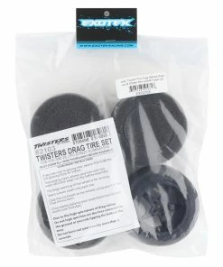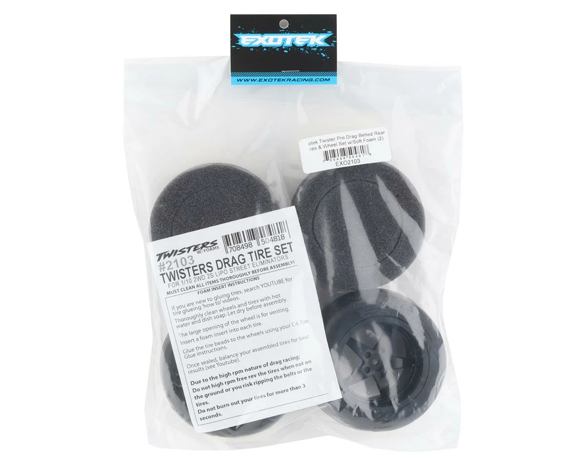 The Exotek Twister Pro Drag Belted Rear Tires and Wheel Set offer the same great performance now with a soft foam insert. Using rubber developed from years of 1/10 touring car racing Exotek has been able to create a consistent, high traction tire worthy of the most serious racers. Wider tire tread with specially designed sidewalls is used to improve sidewall flex and allow for more volume inside the tire. The belting in the tire aids in grip and is best suited for racing at the highest level. Exotek’s design team has gone the extra 1/4 mile to make this the most competitive tire possible.Â